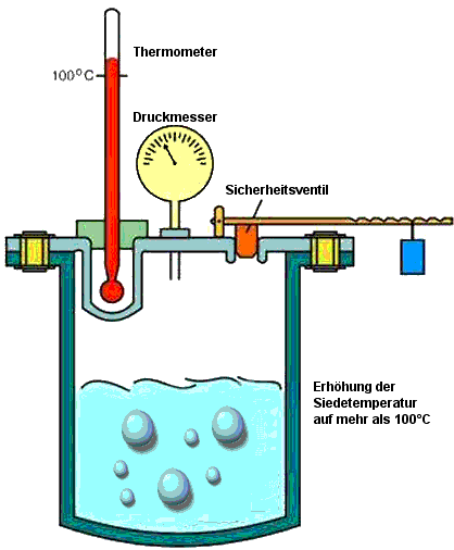Der luftdicht abschließende Deckel lässt im Topfinnern den Dampfdruck wachsen, sodass der Siedepunkt des Wassers auf mehr als 100°C steigt. Durch das Ventil übersteigt der Druck nicht eine gewünschte Höhe.