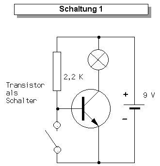 Bei geöffnetem Schalter ist die Basis mit dem Pluspol verbunden (der 2,2 kOhm-Widerstand begrenzt die Größe des Basisstroms), die Kollektor-Emitter-Strecke öffnet.
