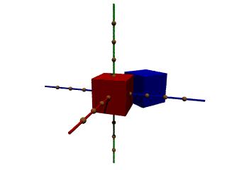 A ist dabei ein gegebener Punkt P(x,y,z), B ist der Vektor, durch den die gewünschte Drehachse dargestellt wird, F ist der Drehwinkel. In der ff. Abbildung (vgl. Skript per Mausklick) sind die Drehachsen rot, grün, blau und gelb dargestellt. Der Startpunkt A=P wird jeweils um eine dieser Achsen mit einem bestimmten Winkel gedreht.