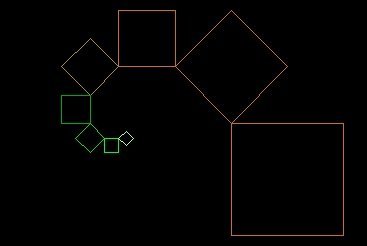 Einen Schritt weiter wollen wir noch gehen: Über jedem linken Kathetenquadrat soll zusätzlich ein rechtes Kathetenquadrat entstehen. Wir benutzten dafür die Befehle [ und ], mit deren Hilfe die Position der Schreibmarke gespeichert und wieder hergestellt werden kann. (Regel und Dateneingabe sind bei der Abbildung)