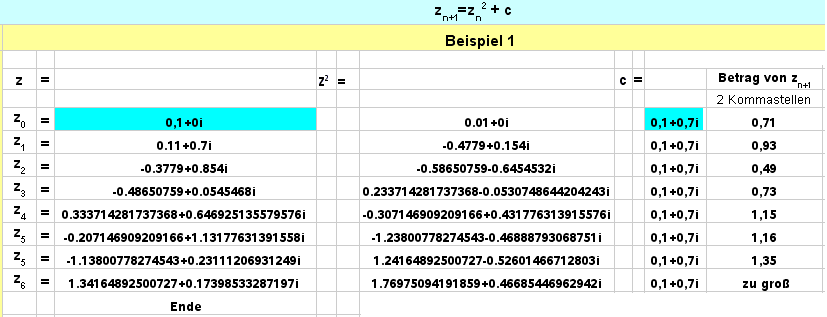 Betrachten wir die Iterationvorschrift zn+1 = zn2 +c und entscheiden uns für einen Startwert z0 und eine feste Zahl c, wobei z0 und c komplexe Zahlen sein sollen.